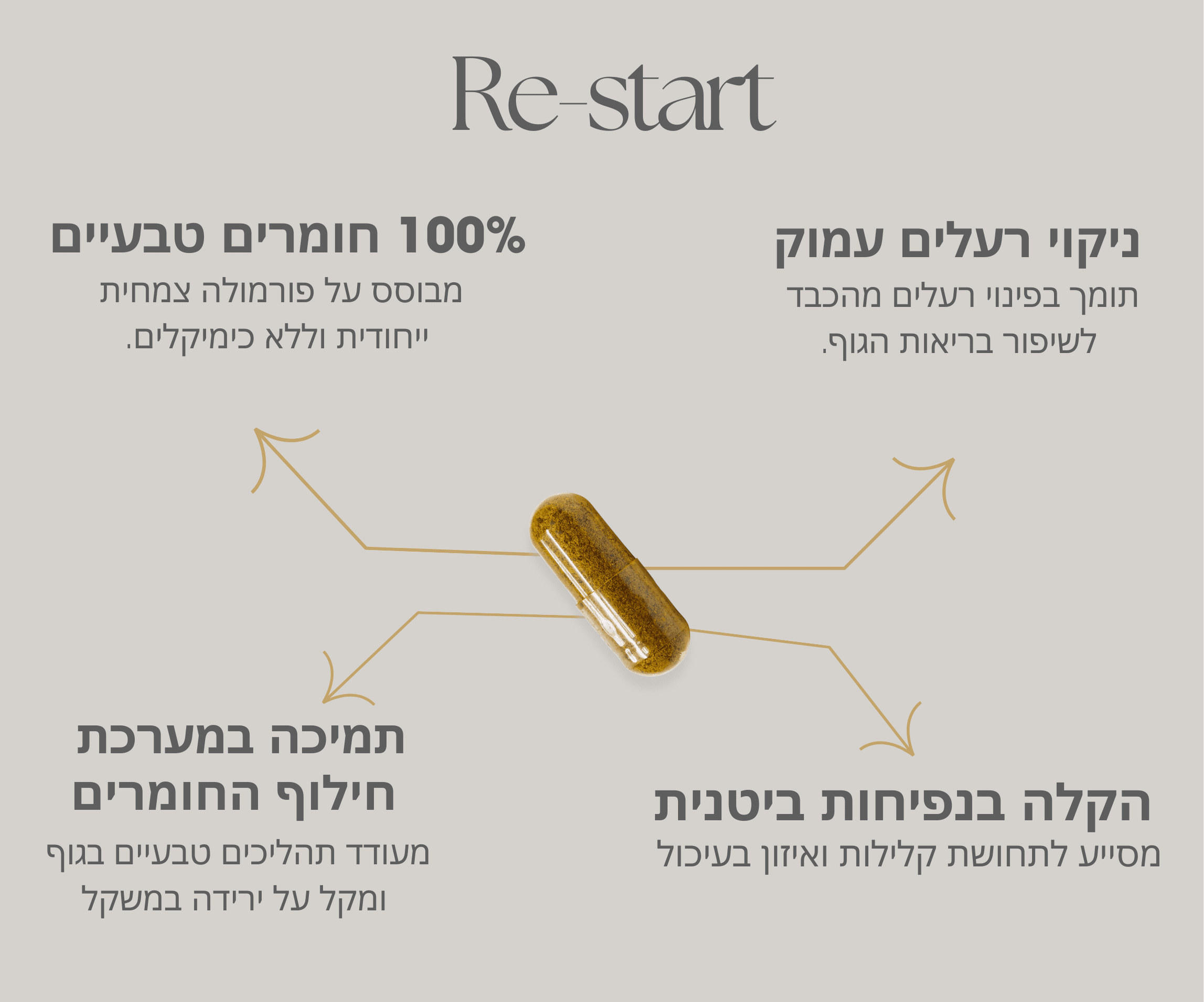 1. RESTART: מתחיל את התהליך בניקוי רעלים עמוק מהכבד, שיפור תפקוד הגוף ותחושת קלילות.
